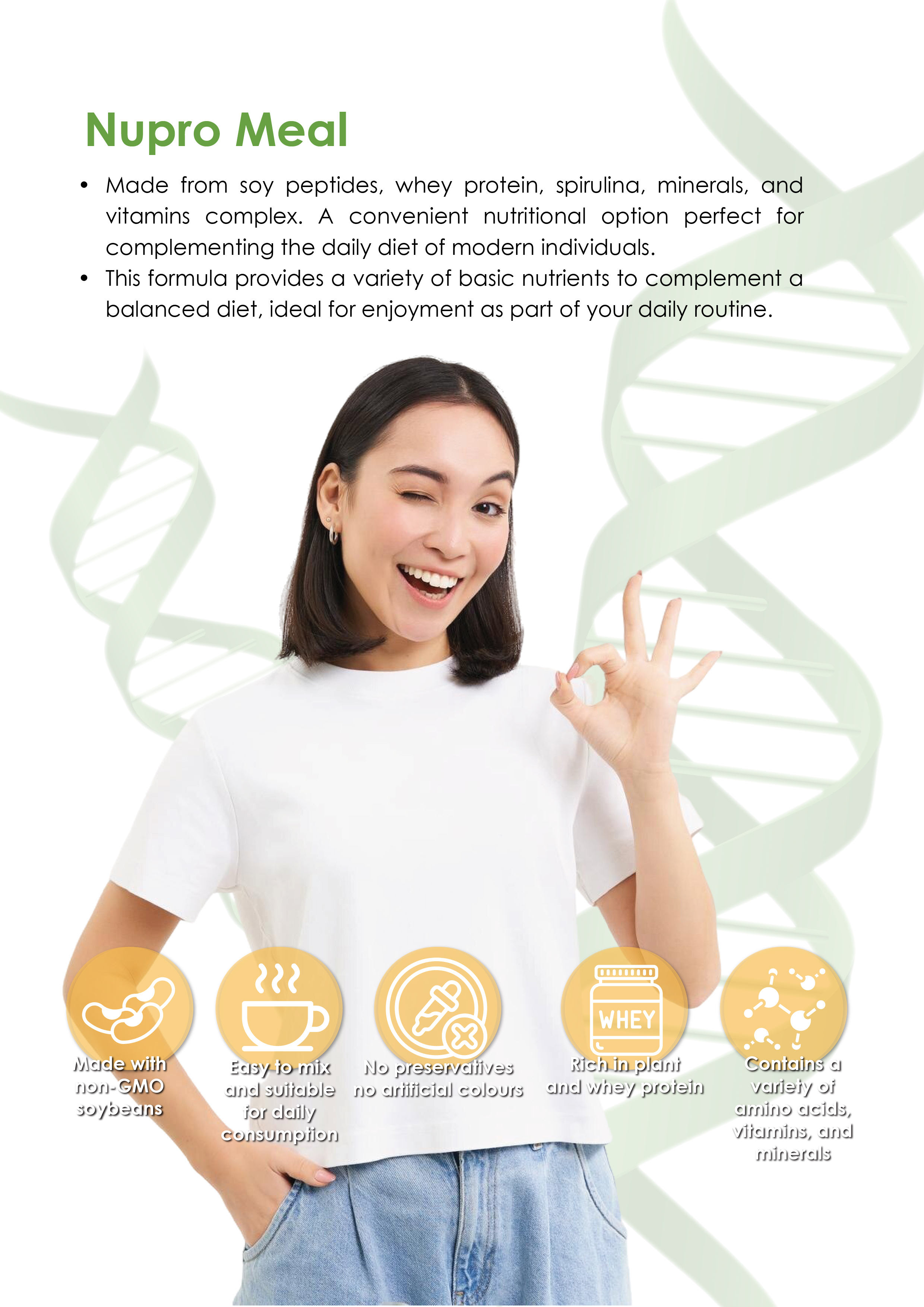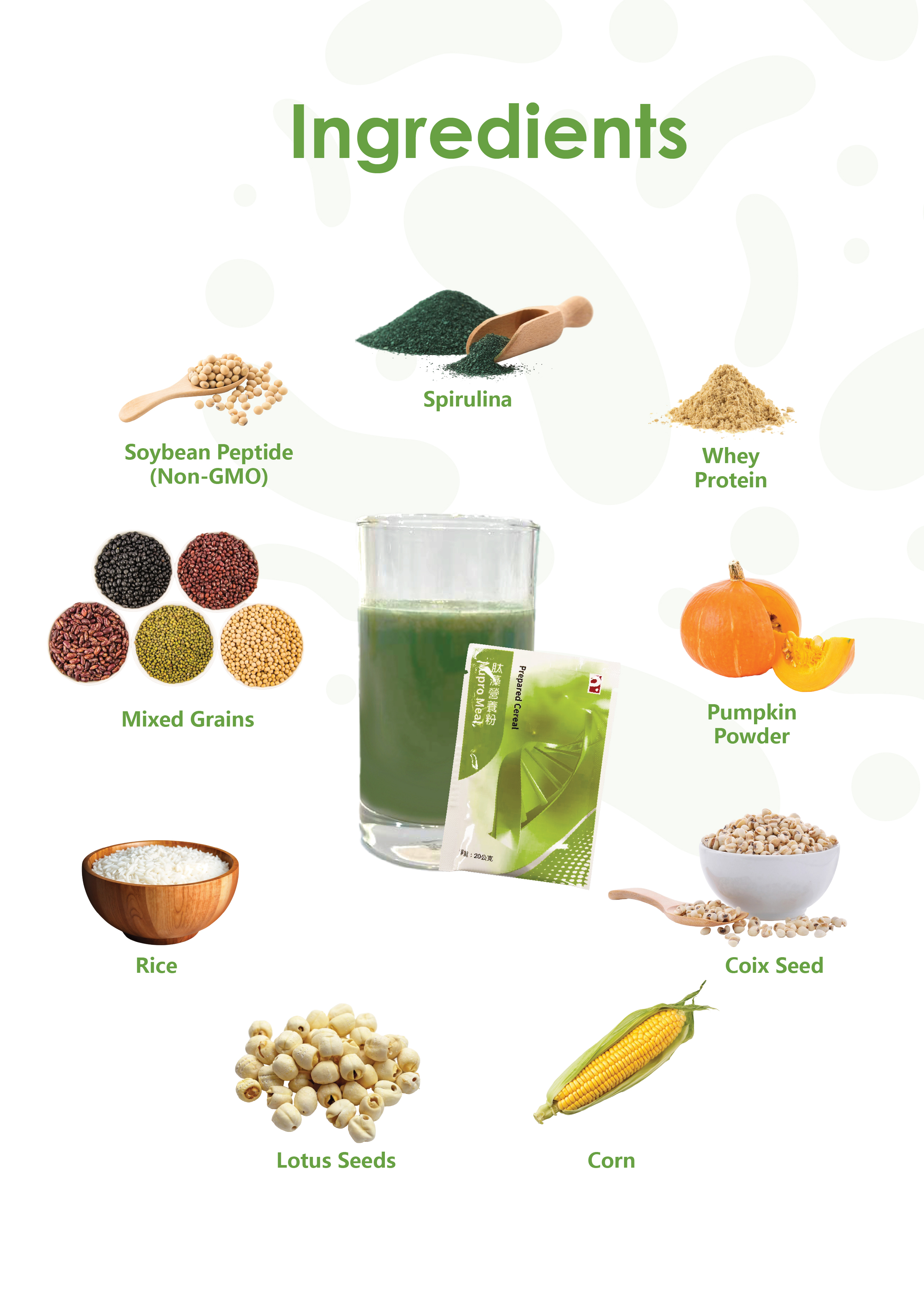 主要成分:大豆胜肽、乳清蛋白、螺旋藻、综合矿物质及维生素